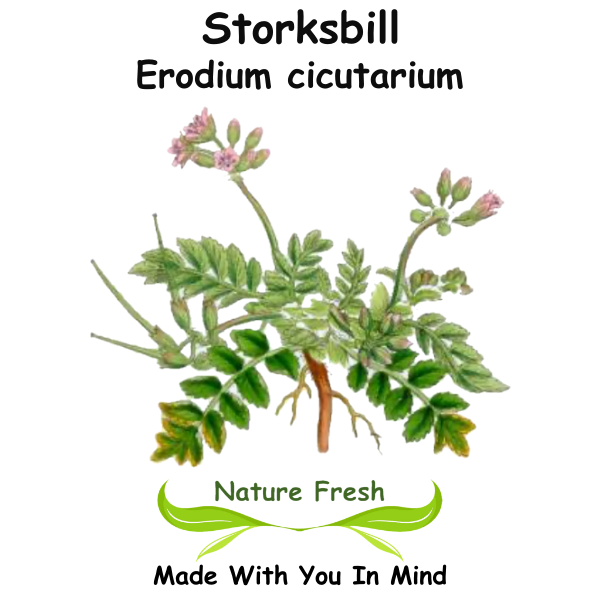 Storksbill (Erodium cicutarium) is prized in traditional herbal medicine for its strong astringent and hemostatic properties, effectively toning tissues to control diarrhea, dysentery, uterine bleeding, and excessive mucus discharges while also acting as a mild diuretic and diaphoretic. Its leaves and aerial parts contain tannins, vitamin K, vitamin C, flavonoids, and phenolic compounds that contribute to demonstrated antibacterial, antifungal, antioxidant, and anti-inflammatory effects in lab studies, supporting wound healing, skin soothing, and minor pain relief when used topically or internally.