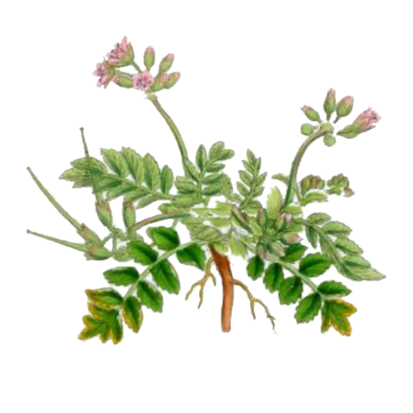 Storksbill (Erodium cicutarium) is a traditional astringent and hemostatic herb used mainly to tone tissues and reduce bleeding. Folk and ethnobotanical records describe teas made from the aerial parts to help with abnormal uterine bleeding, diarrhea, and other forms of excessive discharge, as well as to support milk production in nursing mothers. Leaf infusions have also been used as mild diuretics and diaphoretics, supporting kidney function and gentle detoxification while helping the body manage fevers such as typhoid in traditional practice. Modern phytochemical reviews note that E. cicutarium contains vitamin K, vitamin C, essential oils, and phenolic compounds, which may underlie reported antibacterial, antioxidant, anti‑inflammatory, and analgesic effects, although clinical evidence in humans remains limited.